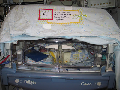I know I mentioned the other day that we had a rough night. I was doing kangaroo care with Cohen and I thought his breathing sounded funny so I had mentioned it to the nurse and she measured his tube to make sure it was in the right place and it was. All his vital signs were fine, so I just tried to be reassured. However, I kept feeling like something was funny with his breathing. As they went to move him back into his isolette his breathing tube came out. He obviously started having a lot of trouble with his breathing and was turning purple while he was on me. They quickly moved him into his isolette and called all the doctors in. At this point I left the room because I was starting to feel really anxious. I'm glad that I did because they had to do chest compressions on him because his heart rate dropped really, really low. They got his tube back in and got him stablized but it took a little bit. In the meantime, I was out in the hallway having my first panic attack :( I thought that my baby was going to die that night and I couldn't bear the thought of losing him. It was just too much for me. Eventually I settled down and went back in to see him when they said he was stable. He was just laying in his isolette looking up at me with the biggest eyes like "Hey, what on earth happened?" I am so thankful that they were able to get his tube back in fairly quickly, the response time for emergencies around there is very good! I am also so glad that my mom was there that night and that it wasn't one of the nights that I was alone. And, being the considerate little fellow that he is, he wanted to make sure that we knew he was okay...I was changing his diaper (he is going to love all these stories some day) and I had put the new diaper underneath the old one because it's too risky for him to have nothing underneath him and sure enough he pooped as I was taking his diaper off. He managed to wreck his old and new diaper as well as the little fabric cover on his bed. When Danny called this morning to check on him we found out that he had done the same thing AGAIN this morning! I guess that's one way to get new sheets!