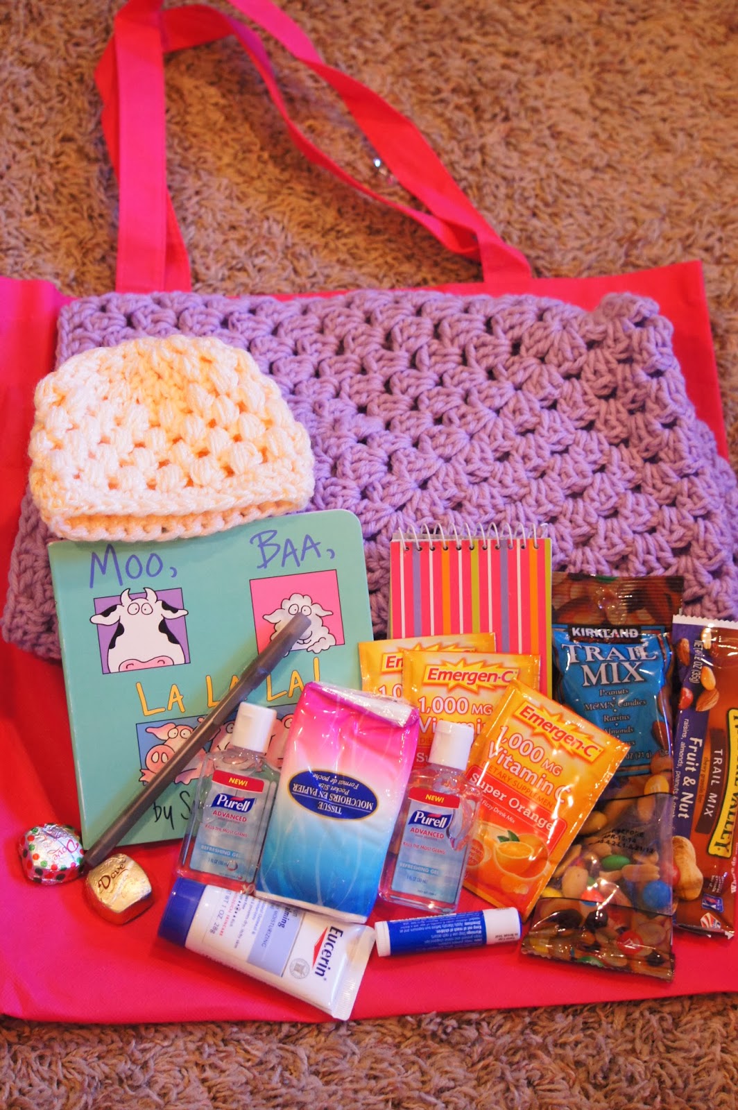 Each care package includes a blanket, hat, small notebook, pen, tissues, Emergen-C, chocolate, granola bar/trail mix, hand sanitizer, chapstick, lotion, and a small children's book.